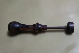 Conjunto de un metro antiguo y un sello de lacre. - Metro de color marrón con detalles metálicos. - Sello con mango de madera oscura y base metálica.
