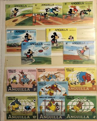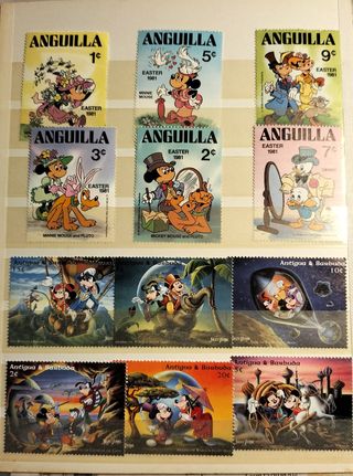 Conjunto de sellos conmemorativos de Anguila y Antigua y Barbuda, con personajes de Disney. - Sellos de Anguila con temática de Pascua de 1981. - Sellos de Antigua y Barbuda con personajes de Disney. - Diseños variados con Mickey Mouse, Minnie Mouse, Pluto, Goofy y Donald. - Incluye sellos de diferentes valores: 1c, 5c, 9c, 3c, 2c, 7c, 15c, 10c, 5c, 20c.