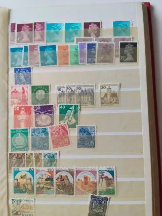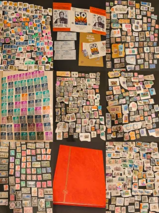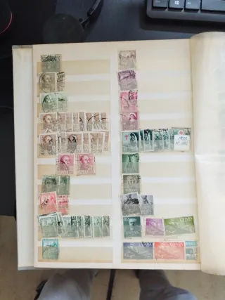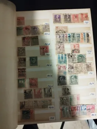 Amplia colección de sellos postales, organizada en 7 álbumes. - Sellos de diferentes épocas y países. - Incluye sellos con valor de 200, 80 y 50. - Diseños variados, algunos con edificios y otros con retratos. “Vendo la colección de sellos de mi abuelo. Son 7 álbumes. Es una colección muy grande y no puedo subir todas las fotos aquí. “El precio es simbólico. Se aceptan ofertas serias.” “En caso de interés, puedo enviar el resto de fotos de todos los sellos de todos los álbumes.” “Esto es solo una pequeña parte de la enorme colección de sellos de mi abuelo que se ve en estas fotos.” “Además, hay seis libros antiguos españoles so