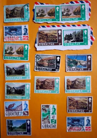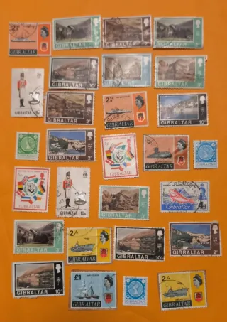 Colección de sellos antiguos de Gibraltar, ideales para coleccionistas. - Varios diseños y valores. - Imágenes de paisajes y monumentos. - Incluye sellos con la efigie de la Reina Isabel II.