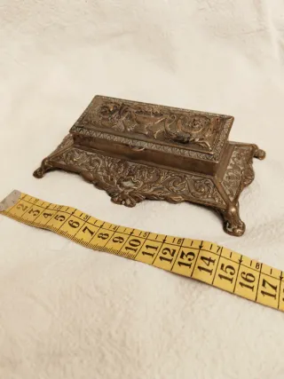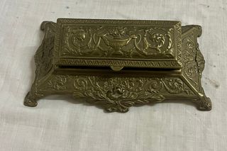 Es una antigua caja de latón o bronce para sellos, con un diseño ornamentado modernista o victoriano. Presenta un relieve detallado con motivos florales y un jarrón central en la tapa. Tiene un acabado metálico envejecido que le da un aspecto vintage o antiguo. Se apoya sobre cuatro patas pequeñas y curvadas. Es un accesorio decorativo típico de escritorios y despachos antiguos. - Material: Latón - Diseño ornamentado con motivos florales y un jarrón en la tapa.