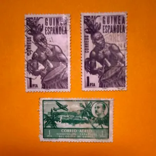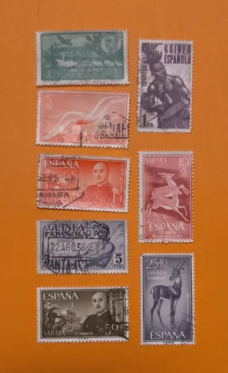 Conjunto de sellos de las antiguas posesiones españolas. Incluye sellos de Guinea Española y Sahara. - Sello de Guinea Española con figura. - Sello de Sahara con ciervo. - Sello de España con retrato. - Sello de España con ciervo. - Sello de Guinea Española con fecha. - Sello de España con paisaje.