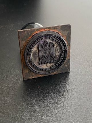 Sello antiguo de tinta con emblema. - Diseño circular con águila. - Inscripción INSPECCIÓN TOMO y PLATA. - Mango de plástico negro.
