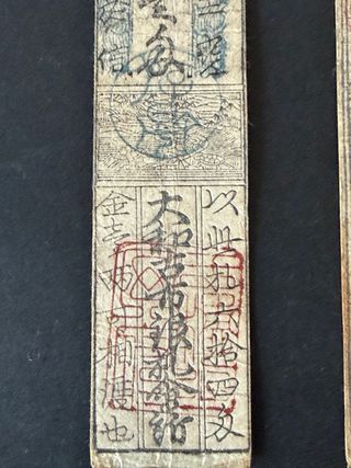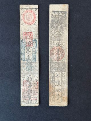 Dos billetes antiguos de papel, conocidos como Hansatsu. - Diseño con sellos y caracteres chinos. - Papel con textura envejecida. NUFILART billetes Japón japoneses RB8