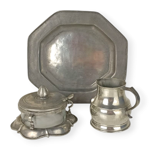Conjunto antiguo de peltre compuesto por bandeja, jarra para vino y azucarero, de diseño clásico europeo. Cada pieza presenta finos detalles artesanales y acabados sobrios característicos de las manufacturas tradicionales de mediados del siglo XX. Están sellados con las inscripciones Europe Etain Zinn 118, indicativo de su origen europeo y de la alta calidad del material. La bandeja es de forma octagonal, ideal para servir o exhibir. Medidas: 25,5cm largo,23,5cm ancho,1cm fondo. Peso: 700gr. La jarra de vino, agua o leche posee un diseño robusto pensada para uso funcional y decorativo (flores, utensilios de cocina) Medidas: 9,...