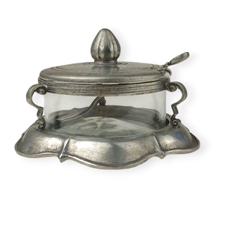Jarra antigua de peltre con un diseño clásico y un sello decorativo. - Material: Peltre - Sello de cera roja con detalles. - Asa robusta y tapa con remate.