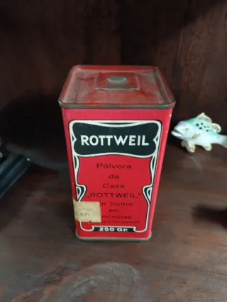 Caja metálica vintage de la marca Rottweil, datada de los años 30. Presenta un diseño con la imagen de un ciervo y sellos. - Material: Metal. - Época: Años 30. - Marca: Rottweil. - Diseño: Ciervo y sellos. - Color: Rojo y blanco.