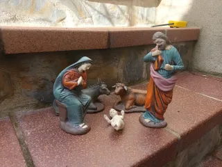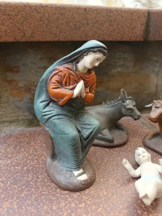 Conjunto de figuras para belén de la marca Ortigas. Representa la escena de la Natividad. - Incluye figuras de San José, la Virgen María, el Niño Jesús, un burro y un buey. - Figuras de estilo clásico y detallado. - Figuras selladas. - El San José con falta en la peana, brazo izquierdo y cabeza pegados todo ello de fácil reparación, según se puede apreciar en las imágenes. - La pieza más alta que es el San José mide 19cm.