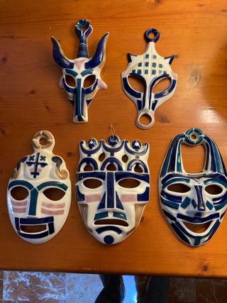 Conjunto de 5 máscaras originales de Sargadelos, cerámica artística gallega de alta calidad. ✔️ Altura: aprox. 20 cm cada una ✔️ Estado: perfecto, sin golpes, grietas ni restauraciones ✔️ Sello: SARGADELOS original visible en todas las piezas ✔️ Época: años 70 ✔️ Se venden como conjunto, no por separado No son las máscaras actuales de producción continua (que rondan los 50 €), sino piezas de mayor tamaño, más antiguas y de carácter coleccionable, cada vez menos frecuentes en este formato y estado. Ideales para: • Coleccionistas de Sargadelos • Decoración contemporánea con identidad