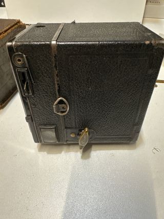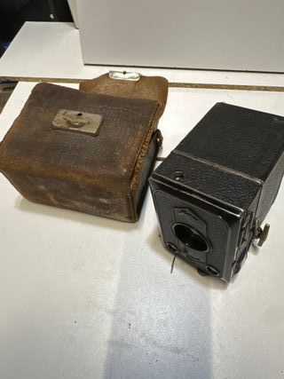 Pieza de colección: cámara antigua Zeiss. - Cámara de color negro. - Estuche de cuero marrón con cierre metálico. Como curiosidad, lleva el sello de aduanas y su funda