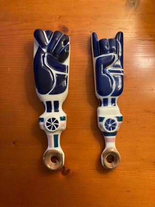 Original conjunto de dos piezas decorativas de cerámica de Sargadelos, con forma de manos. Años 70. Está perfectamente conservado y tiene el sello original.