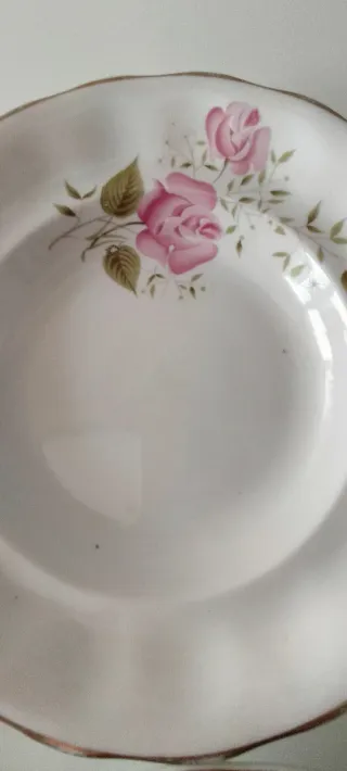 Conjunto de cuatro platos hondos, antiguos, de loza fina, de principios siglo XX. Decorados con un delicado estampado floral de rosas y bordes con cenefa dorada. No es visible el sello del fabricante. Uno tiene un pequeño defecto en zona posterior. Miden 25 cm de diámetro. También vendo por separado. Precio de un plato 10 € Precio de dos 18 €. Precio del lote completo 32 € con envío gratis. - Diseño clásico con borde dorado. - Estampado de rosas en tonos rosados y verdes. - Piezas de vajilla antigua con encanto.