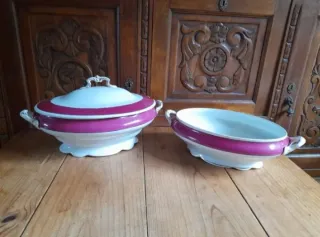 Antiguo lote de sopera con tapa y otra sin ella de tamaño más pequeño, detalles en rosa y oro, buen estado general. Sello San Juan de Aznalfarache, Sevilla, China Opaca.