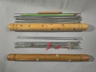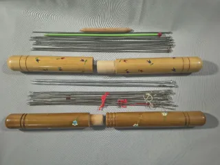 Dos estuches de madera para guardar agujas para tejer o hacer media (como dice mi madre). Incluyen agujas varias. Algunas de la marca Dama. Del número 0, 1, 2, 5... A las que terminan en bola no sé verles número ni marca. El de color oscuro tiene alguna marca de uso evidente. El de color claro está casi como nuevo. En muy buen estado para ser de los años 60. En su interior puede leerse "modelo patentado". Y un sello de "Almacenes Jorba". Famosos almacenes de Barcelona (Can Jorba) que cambió de nombre en 1964 después de que Ruiz Mateos los comprase. #funda #canuto #estuche #tejer #agujas #crochet #punto #ganchillo #vintage #antiguo