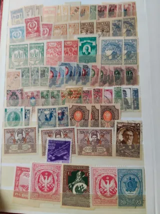Colección de sellos antiguos de diferentes países y épocas. - Sellos de Checoslovaquia, Hungría, Polonia, Rumanía y otros. - Diseños variados con retratos, monumentos y motivos. - Valoraciones y fechas visibles en algunos sellos.