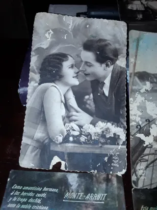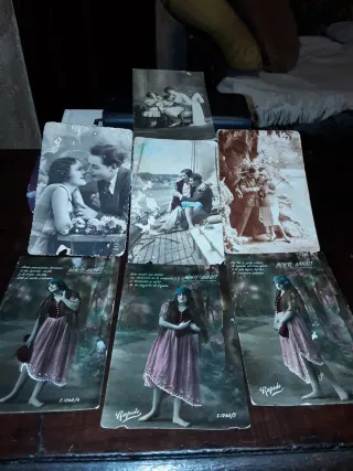 Conjunto de 7 postales antiguas, ideales para coleccionistas. - Imágenes variadas de parejas y figuras femeninas. - Algunas postales incluyen texto y sellos. - Perfectas para añadir a una colección existente.