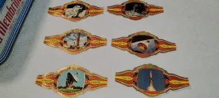Colección de vitolas antiguas con diferentes diseños. - Cada vitola presenta una imagen detallada de monumentos o paisajes. - Diseños variados con bordes dorados y detalles en rojo y amarillo, no vendo sueltos, solo entrega en persona en Sevilla capital. .
