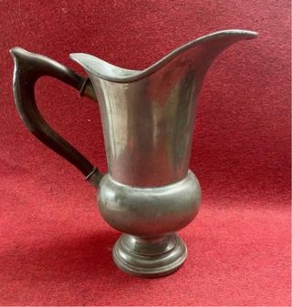 Antigua jarra aguamanil de peltre sellada , asa de madera. - medidas en las fotos