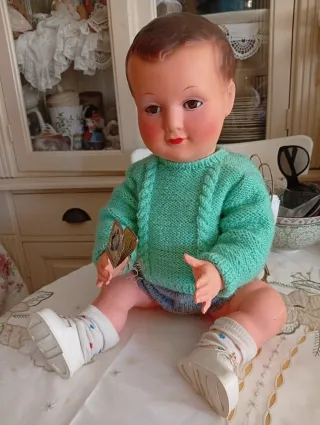 Precioso muñeco antiguo de celuloide, con un sello distintivo. - Material: Celuloide. - Detalle: Sello original.