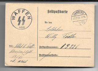 Postal de campaña Feldpostkarte de la Segunda Guerra Mundial. Postal original de la Segunda Guerra Mundial. Se ofrece una Postal original de la época del III Reich alemán. Es un documento antiguo y muestra señales de desgaste por el paso del tiempo. PRECIO NO NEGOCIABLE - Alemana Nazi III Reich Swastika - - Sello de Hamburgo con fecha 27.12.39. - Destinatario: Soldado Willy Todte. - Número de postal de campaña: 133726. Solamente se exponen como artículos históricos coleccionables, en base a su interés para colecciones privadas filatélicas, numismáticas, militaría, o para investigación histórica..