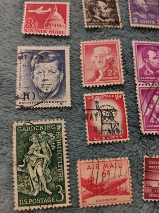 Lote de más de 80 sellos antiguos de Estados Unidos de América, la mayoría franqueados, pero alguno hay que no. Son todos de los años 50 y años 60. Tengo muchos más de otros paises por si quieres hacer algo con ellos de decoración vintage, estos 80 sellos los vendo en un pack por 10€, si quieres llevarte más te paso fotos y podemos negociar precios. De USA Hay de la estatua de la libertad, presidentes como Kennedy, Lincoln y otros, aviones edificios, tienen ese aire antiguo de las cosas de antes. para colección, decoración, etc. se pueden enviar por correos ordinario que solo vale 1€