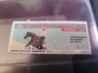 Dos sellos antiguos de correos españoles. Uno con temática navideña, mostrando la Adoración de los Pastores. El otro, dedicado a los Campeonatos del Mundo de Hípica de Jerez. Ambos sellos parecen estar en buen estado, conservados en una carpeta de plástico. - Temática: Navidad y Deportes Ecuestres - País: España - NEGOCIAR