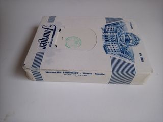 Baraja de cartas Fournier, fundada en 1868. - Diseño de edificio emblemático. - Sello verde circular con texto en relieve. IA Baraja de cartas antiguas Heraclio de Fournier con precinto y en funda roja de cartas. También varias cartas sueltas con instrucc del juego de la canasta. No correos. Envios inpost