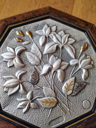 Caja joyero italiana de autor. Elaborada en madera DM color marrón oscuro con un relieve floral en plata de ley 925, con detalles en dorado. La plata tiene un sello italiano que indica que es plata de ley 925 y también 5-7 g, que hace referencia al recubrimiento. También lleva la firma del diseñador y el anagrama del taller de joyería que produjo la caja. - Caja octogonal de madera, antigua. - Relieve floral en plata de ley 925. - Detalles dorados en el relieve. - Firma del autor visible.