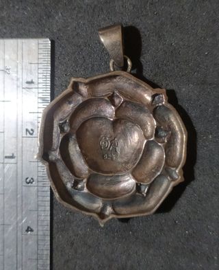 Antiguo objeto religioso, relicario, con medalla , la placa lleva una inscripción y un sello. Parece baño de plata