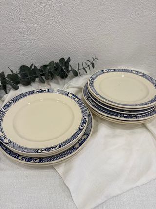 Lote de vajilla antigua francesa Lunéville (Keller & Guérin), principios del siglo XX. Clásico diseño de cenefa azul sobre fondo marfil, elegante y atemporal. El lote incluye: – 3 platos hondos en muy buen estado 24,5 cm – 3 platos llanos (1 en buen estado y 2 con pequeño chip) 24,5 cm – 7 platos de postre (5 en buen estado y 2 con pequeño chip) 22 cm Los pequeños chips están indicados y visibles en las fotos, no afectan al uso del conjunto. Un plato de postre sin sello impreso, con marca en el agua. Ideal para mesa diaria, segundas residencias o para combinar con vajilla blanca.