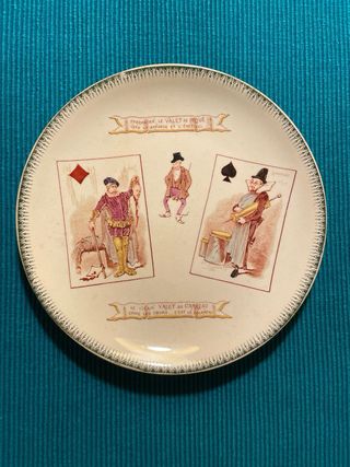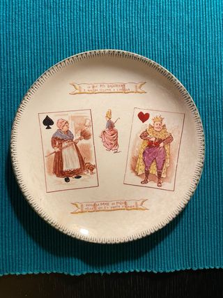 Pareja de platos decorativos de faïance fine,de la prestigiosa fábrica Creil & Montereau. (Francia,siglo XIX). Serie satírica inspirada en cartas/naipes con escenas humorísticas típicas de la época. Diámetro: 20cm cada uno. En buen estado, sin roturas ni faltas; esmalte ligeramente craquelado por el paso del tiempo. Colores bien conservados Con sello de antiguo distribuidor en España ( Plaza Santa Ana, Madrid). Son piezas de colección con interés histórico y decorativo. Diseño con ilustraciones de cartas de juego y texto y borde decorado con motivos geométricos dorados.