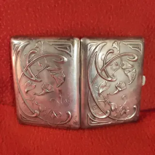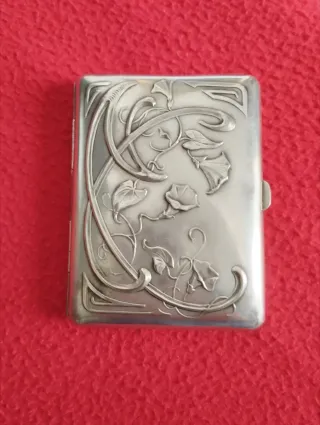 Magnífica pitillera antigua francesa plateada de principios siglo XX, adornada con un elegante diseño floral. Presenta un punzón que certifica su autenticidad, así como el sello XTRA BLANC. Muy buen estado general con una hermosa pátina de época. Conserva las gomas elásticas interiores, no presenta abolladuras y cierra perfectamente. Una pieza refinada para coleccionistas o amantes de las antigüedades. 8,5 x 6,5cm. 1,4cm fondo