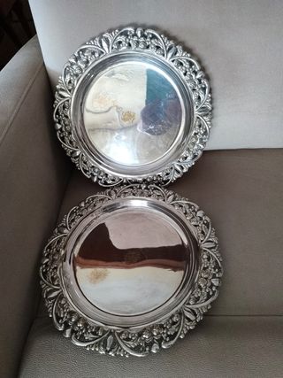Bañados en plata y con detalles dorados, en las flores. INICIALES en el centro del plato. PRECIO 50 € DE LA PAREJA. Con el sello del orfebre, que se ve en las últimas fotos. Antiguos. Iguales. Medidas: Diámetro: 28'5 cm En buen estado. Bien conservados. Se entregan tal como están en las fotos, limpiados con producto inglés específico para plata.