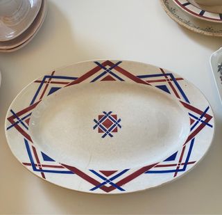 fuente ovalada de loza francesa antigua de la prestigiosa marca Ceranord St Amand, modelo “Basque”, fabricada en Francia. Diseño geométrico Art Déco en rojo y azul, muy representativo de mediados del siglo XX. Ideal para uso o como pieza decorativa vintage. Características: • Marca: Ceranord St Amand (sello visible en la base) • Modelo: Basque • Medidas: • Estado: Bueno, con señales normales de uso para su antigüedad (ver fotos) • Material: Loza francesa Perfecta para: • Coleccionistas de loza vintage • Decoración retro o cocina con estilo • Completar vajillas antiguas francesas Entrega en mano o envío. ¡Consulta sin compromiso! #ceranord #vajillafrancesa #stamand #lozavintage #fuenteovalada #vajillaantigua #artdeco #decoraciónvintage #piezasúnicas #vajilladecolección #hechoenf LAS FOTOS FORMAN PARTE DE LA DESCRIPCIÓN