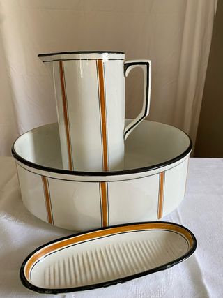 Elegante juego vintage de loza esmaltada blanca con detalles en líneas mostaza y negras. Fabricado en Francia por la reconocida casa Moulin des Loups & Hamage (sello original en la base). Ideal para decoración de estilo retro, rústico, vintage o para coleccionistas de loza europea antigua. 🧼 Perfecto para baños decorativos, casas rurales o ambientaciones clásicas. 📏 Dimensiones aproximadas: • Jarra: 26cm alto x 18 cm ancho (con asa) • Palangana: 35 cm diámetro x 12 cm alto • Jabonera: 23 cm largo x 9,5 cm ancho x 3 cm alto Vintage #LozaAntigua #DecoraciónRetro #MoulinDesLoups #Hamage #CerámicaFrancesa #DecoraciónVintage