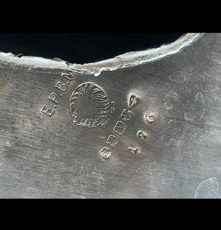 Antigua y bonita fuente o bandeja redonda de alpaca. Diseño con borde festoneado y acabado brillante. Mide 28 cms de diámetro. Buen estado de conservacion. Ver sello de la joyeria en fotografías.