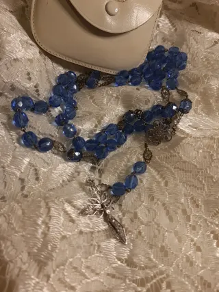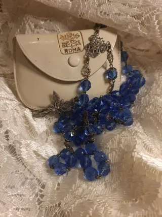 Precioso rosario antiguo con cuentas de cristal azul y detalles en filigrana de plata. - Cuentas de cristal azul facetado.Largo 50cm - Cruces y medalla en filigrana de plata. - Incluye estuche de cuero con sello 'Roma'. -De coleccion , poco usado.Entrega en mano.120€