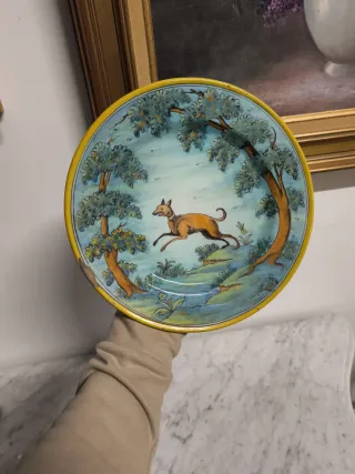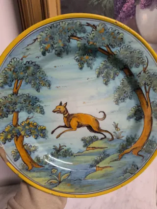 Plato antiguo de cerámica de Talavera sellada en la trasera con la marca del alfar de Ruiz de Luna Decoración pintada a mano con un perro de rehala corriendo en un tupido bosque. Súper decorativo y bonito. Ideal para coleccionistas mide 25cm de diámetro. Estado según fotografías VDV46 Niveiro saso Pedro de la cal San José la Purísima el Carmen fajalauza jarrón Triana Manises antigua antigüedad porcelana alcora Limoges escandinavo rústico vajilla Sévres jarro Meissen granja cristal Napoleón III isabelino popular barro cocido lebrillo puente del arzobispo isabelino victoriano bronce dorado virgen galgo teckel collar sol vajilla oro