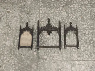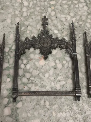 Antiguas sacras realizadas en metal plateado. Diseño neogótico con formas arquitectónicas. Siglo XIX. Están selladas Meneses miden: 32'7*23'1cm la grande, y 27'3*13'1cm las pequeñas Estado según fotografías VDV2530 art Nouveau deco modernista antigüedad Jesucristo Hachero candelero capilla virgen del Rocío altar cofradía hornacina barroco hermandad santo niño Jesús cuna cristo relicario estampa retablo colección inmaculada concepción vintage retro repujado plata punzón alpaca bronce dorado talla capipota ángeles benditera antiguo Macarena óleo cuadro vía Crucis crucifijo cruz madera Segre subasta biblia ofrenda Olot pan de oro
