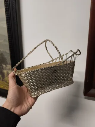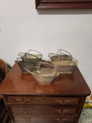 Conjunto de 5 portabotellas realizados en metal plateado. Tienen forma de canasto para dejar la botella y tienen asa arriba para poder servir Los 4 del fondo son de la afamada marca de orfebrería francesa Christofle. El delantero no está sellado Precio: 30€ el que no tiene sello, 90€ el resto VDV1539 VDV839 VDV817 VDV2226 VDV2227 deco modernismo modernista Borgia Conti hanbel zara kave home herraiz midcentury Hispania lalique Meissen Sévres Corbusier fuente servir vajilla plato retro antigüedad antigua antiguo óleo cuadro ébano pájaro cuarzo pan de oro dorado plata alpaca meneses cruz de malta copa bohemia ercuis cartuja Manises