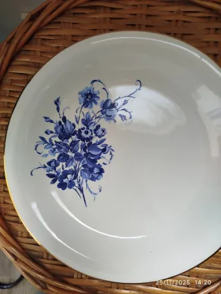 Añade un toque de elegancia vintage a tu hogar con este plato decorativo de porcelana. Su diseño presenta unas preciosas flores en tonos rosas y rojos con hojas verdes, sobre un fondo degradado en azules, creando un efecto suave y artístico. La parte trasera del plato tiene un sello, aunque algo difuso, que parece ser de St. Amand & Hamage, una conocida fábrica de porcelana francesa. El craquelado de la superficie le da un auténtico aire antiguo y de historia. Es una pieza ideal para coleccionistas de porcelana antigua, amantes de los motivos florales o para quienes buscan un elemento decorativo con encanto y personalidad.