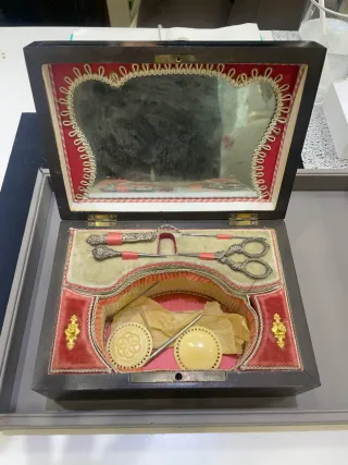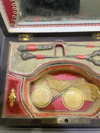 Elegante caja de costura de madera oscura, datada en el siglo XIX. Tijeras de plata. Presenta un interior forrado en terciopelo rojo y crema, con un espejo en la tapa. - Incluye varios utensilios de costura de metal y marfil. - Detalle de ornamentación dorada en el exterior. Antiguo antigua muñeca monedas reloj sello bronce cuadro oleo cobre plata abanico encaje mantilla mantón colección