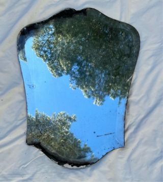 Espejo antiguo biselado con original forma de la fábrica de lunas plateadas zaragozana La Veneciana. Según se lee en la etiqueta hay un sello que lo data en enero de 1948. Medidas (cms): 65 alto x 49 ancho. No tiene estructura de madera trasera. Importancia histórica: La Veneciana reconocida por su calidad en la fabricación de espejos y cristales, lo cual incrementa su atractivo como objeto de colección. Demanda y popularidad: Los espejos de esta época y manufactura son valorados en el mundo de las antigüedades, especialmente aquellos con detalles únicos y etiquetas originales intactas.