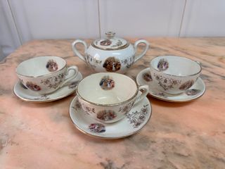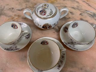 Juego de café o té antiguo de la prestigiosa marca sevillana Pickman y Cª La Cartuja de Sevilla, datado entre 1840 y 1880 aproximadamente, como confirma el sello del ancla en la base de las piezas. El conjunto incluye un azucarero y tres tazas con sus respectivos platos. Fabricadas en loza o porcelana, estas piezas presentan el esmalte original y decoraciones clásicas, mostrando el desgaste natural y craquelado propio de su antigüedad, lo que añade autenticidad a su valor de colección. - Piezas con decoración detallada. - Diseño clásico y elegante.