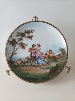 Plato de fina porcelana alemana con la decoración central de unos adolescentes y un perro en el campo. Pieza con su numeración en la parte posterior y sello de la fabrica donde se fabricó. El soporte no se manda se utiliza únicamente para hacer las fotos. Más artículos interesantes. Sillas nórdicas Skaraborg, Thonet, Tapiovaara, espejo estilo veneciano, Art Decó, Gio Ponti, Limoges, Capeans, Vargas Segovia, Eschenbach, Wedgwood, lámparas industriales esmaltadas, Fase, flexos, maletas antígüas, costureros, pupitre, esculturas Rakoto, Pedro Borja cubismo, WMF jarrón cristal, libros.