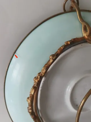 Antiguo centro de porcelana con elegante engarzado en bronce con tres patas y magnífica pintura central. Una pequeña falta en la parte baja del plato como se muestra en una foto que no afecta a la parte superior del mismo. Algunas notas de uso en el dorado que le dan personalidad al mismo. Medidas: diámetro 26 cm y altura de 13 cm. Tono aguamarina en la parte inferior del borde y sello o marca en centro inferior. Más artículos interesantes. Porcelana Limoges, Rosenthal, Capeans, Sevres, Wedgwood, Weimar, Kaiser, figuras Lladró, Nao, Murano, Algora, lámparas esmaltadas, Fase, butacas inusuales, espejos antiguos, cristalería especial.