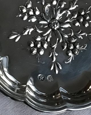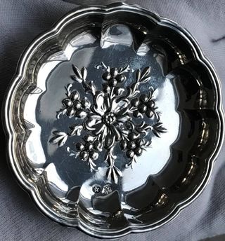 Plato de plata de ley nuevo con diseño floral y sus punzones en la parte inferior, con un peso de 16,47g se vende a menos de su precio al peso en plata Regalo además un fósil de diente de Otodus Obliquus el antepasado del Megalodón Entrega en mano en Málaga o envío a toda España. Más lotes similares en mi perfil *No mirar* Monedas antiguas, numismática, lote chimenea cadena metales sellos llaveros fósiles militar coche piso fusil guerra civíl pieza garaje puerta navidad lluvia paraguas pc patinete enchufe