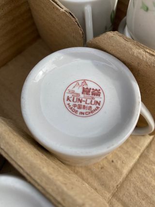 Dos juegos de vajilla de café. Cada una contiene 6 tazas y 6 platos. Una de ellas sin sello. La otra tiene sello chino, KUN-LUN. Made in China. Sin usar, en su caja. Hecho de porcelana. Precio del anuncio por cada juego de vajilla.