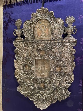 Antiguo Relicario , México, de taller colonial, en panel de plata, cincelado y repujado, a modo de tabernáculo, coronado con copas y florestas. final SXVII, pps S XVIII. Reliquias del Lignum Crucis, San Gregorio VII, papa, Sto Toribio, Sta Rita de Casia, S Teodosio…, etc En cápsula central, Madonna con el niño en brazos, rodeada de perlas a modo de flamas. Con sello de lacre trasero, con escudo de nobleza familiar o arzobispal. Comparen con el que salió en subasta por 4000 €. Coleccionistas. 51 cm x 34 cm.