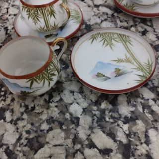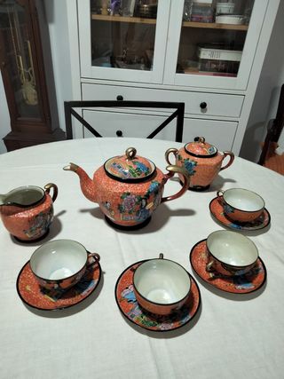 Conjunto decorado con escenas típicas orientales, con relieve, dibujadas y coloreadas a mano. Interior anacarado. Se compone de 4 platillos, 4 tazas, una tetera con tapa, una lechera , y una azucarera. Todas las piezas tienen el sello en la parte inferior. Medidas de las piezas: Plato: diámetro, 11 cm Taza: altura, 3,5 cm; diámetro: 7,5 cm Tetera: altura con tapa, 15 cm; diámetro máximo: 10 cm Lechera: altura con tapa, 11,5 cm; diámetro máximo: 7 cm Azucarera: altura sin tapa, 8,5 cm; diámetro máximo 8 cm El estado es óptimo las piezas aunque con marcas interiores de uso no presentan desperfecto alguno, ni muescas ni rallas.